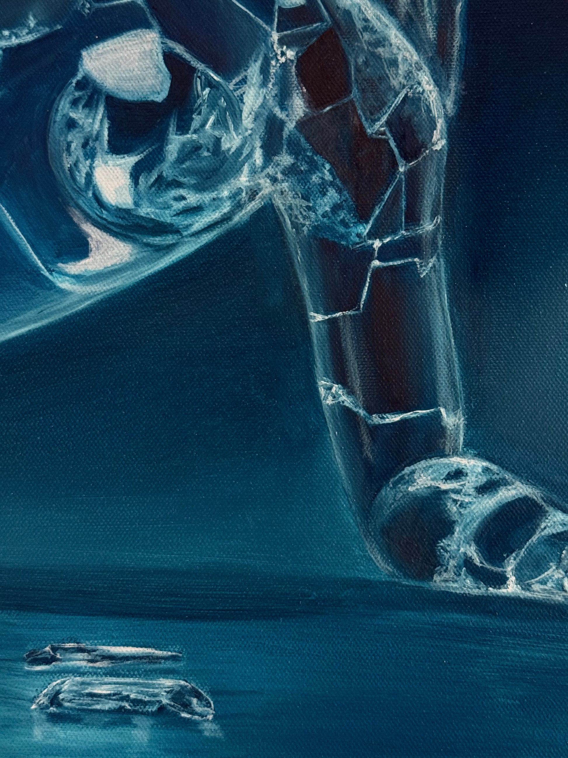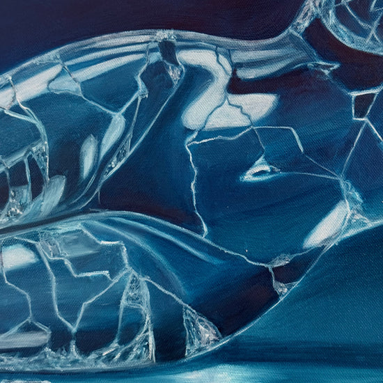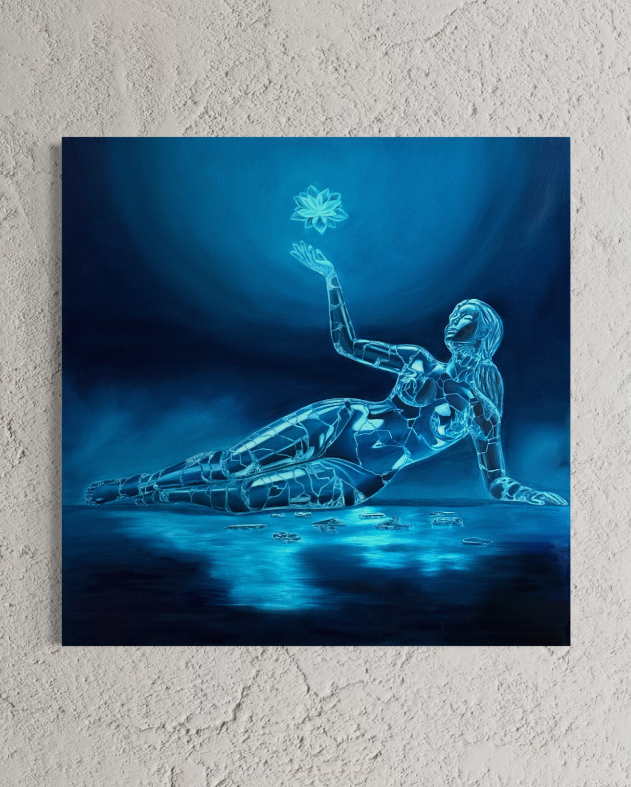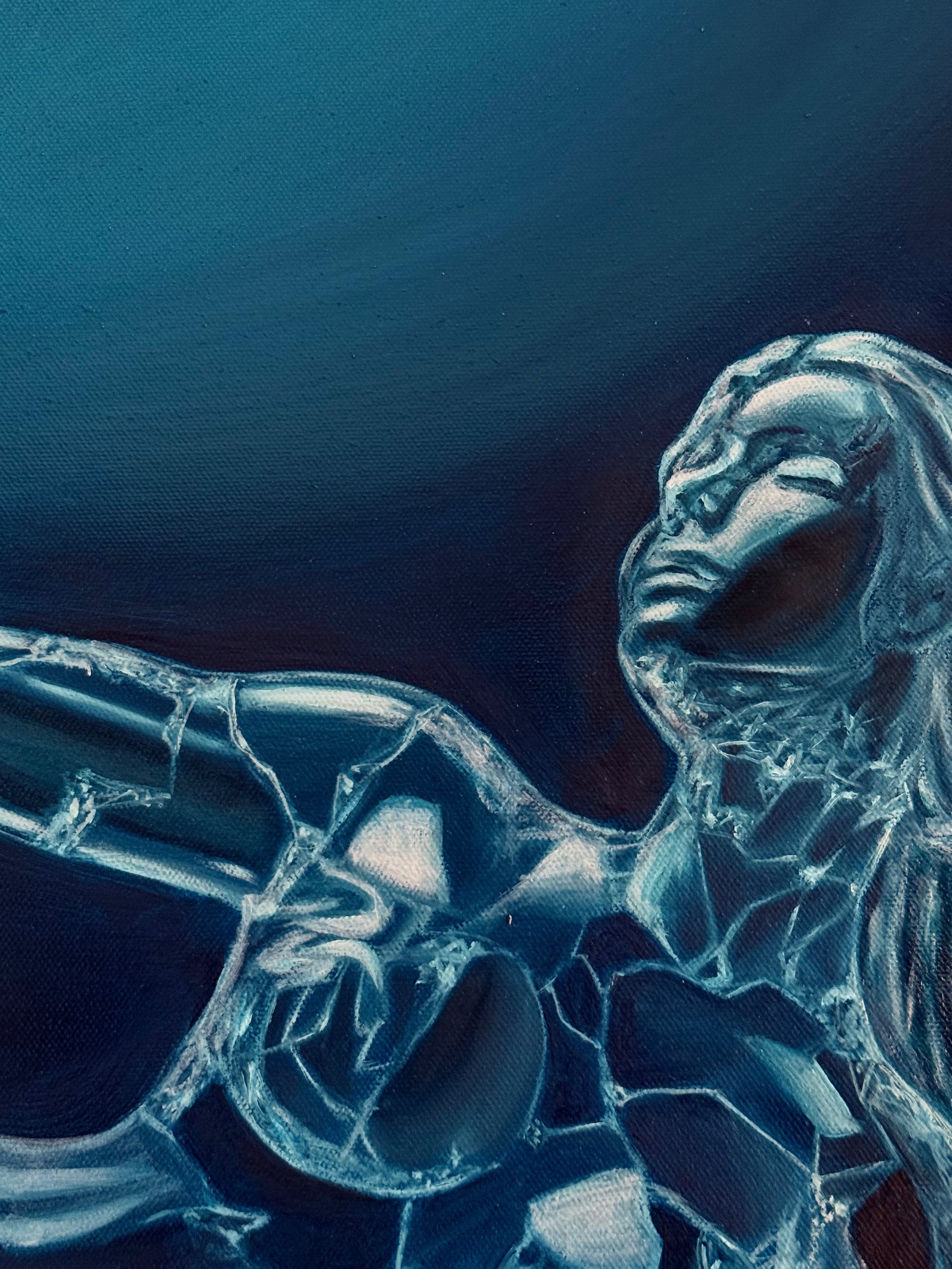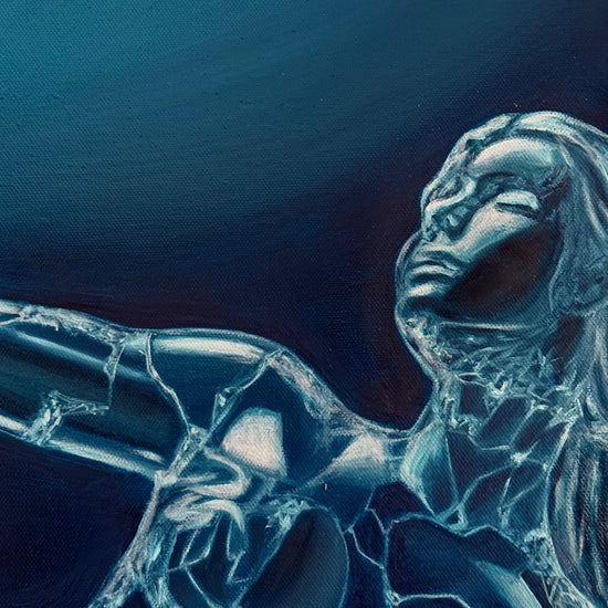 The figure appears fragmented, composed of reflective surfaces that reveal both presence and absence.